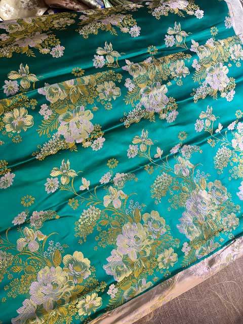 生地は鮮やかな緑色に、金色の牡丹柄の中国産シルク生地です。